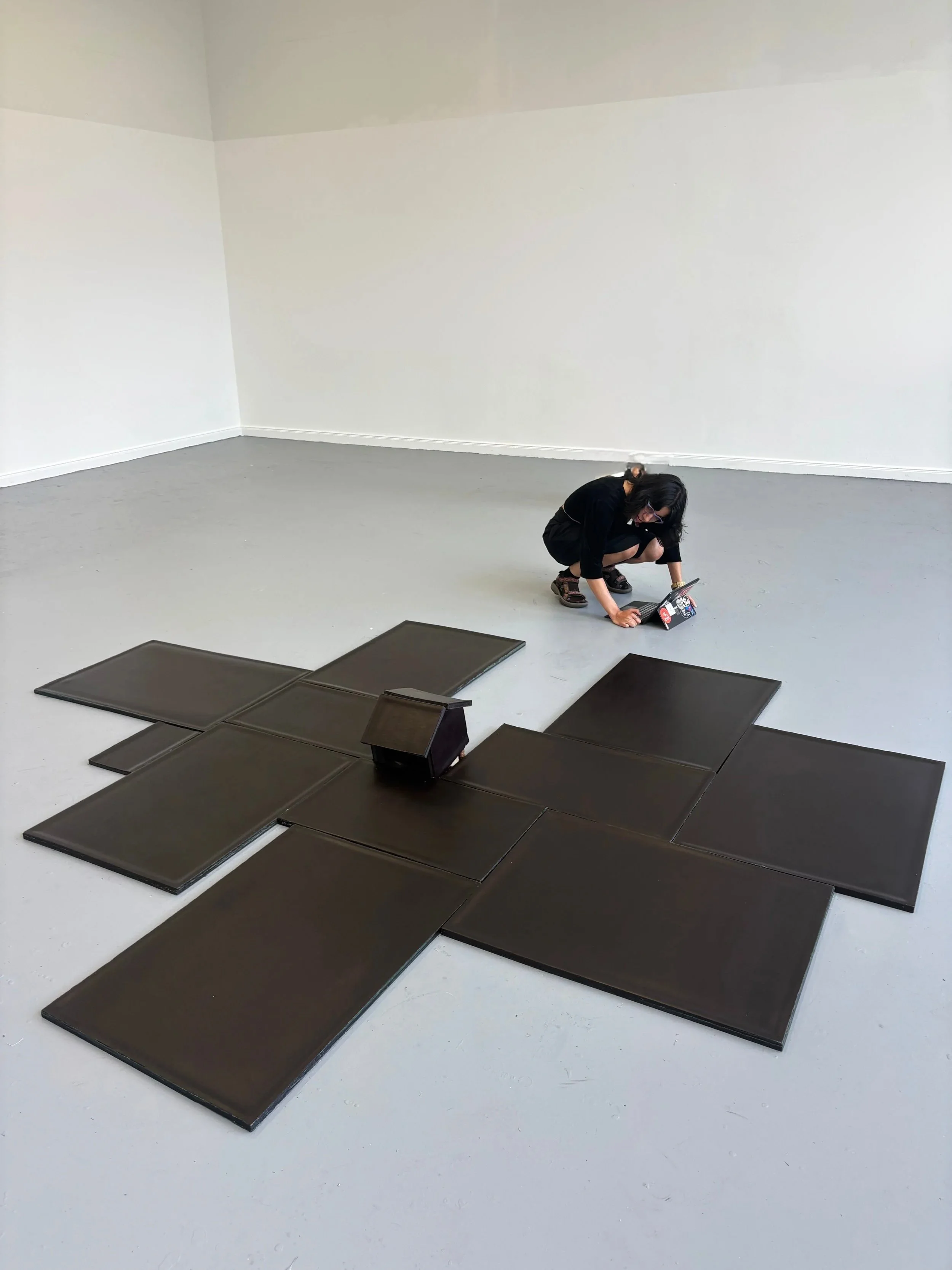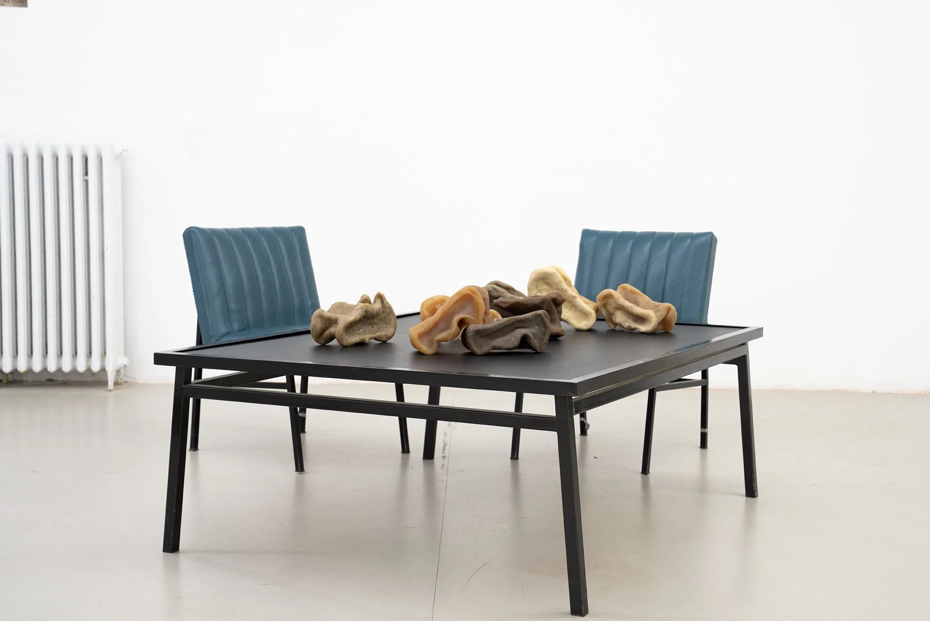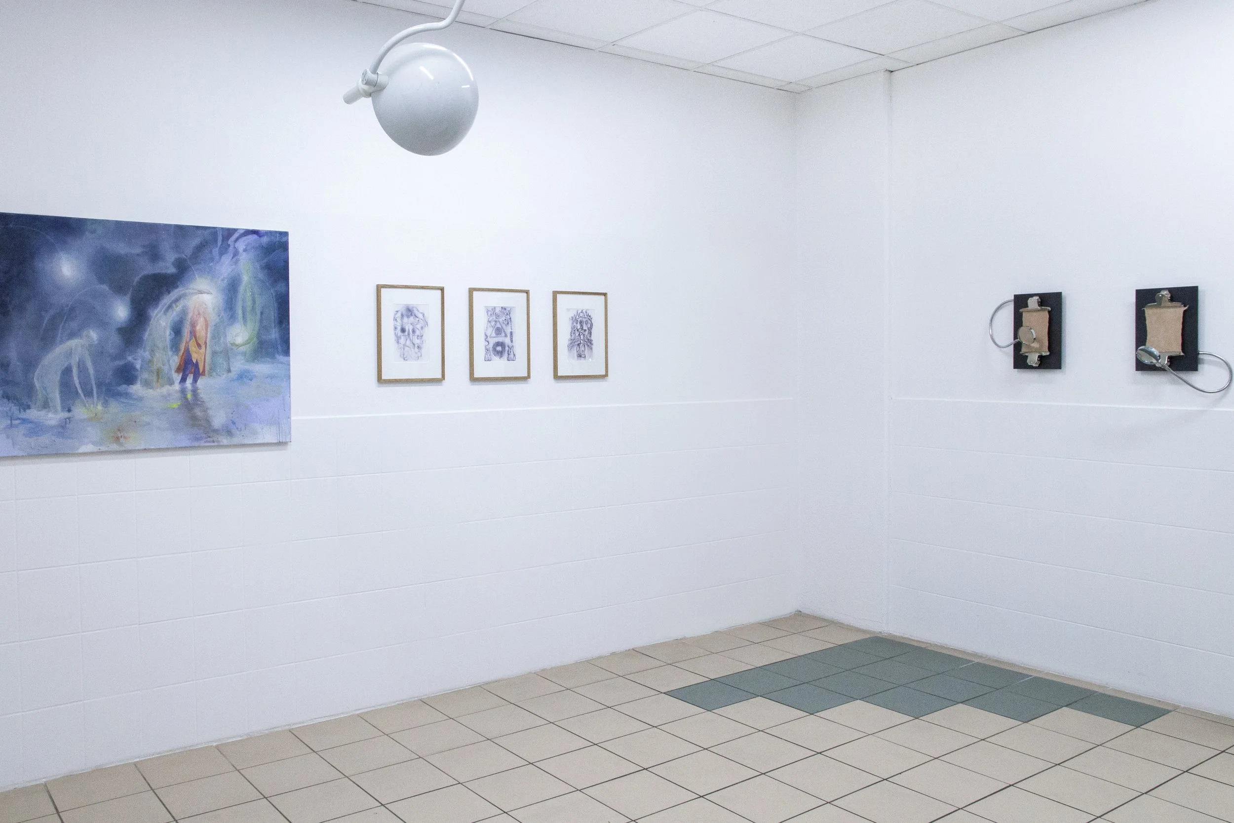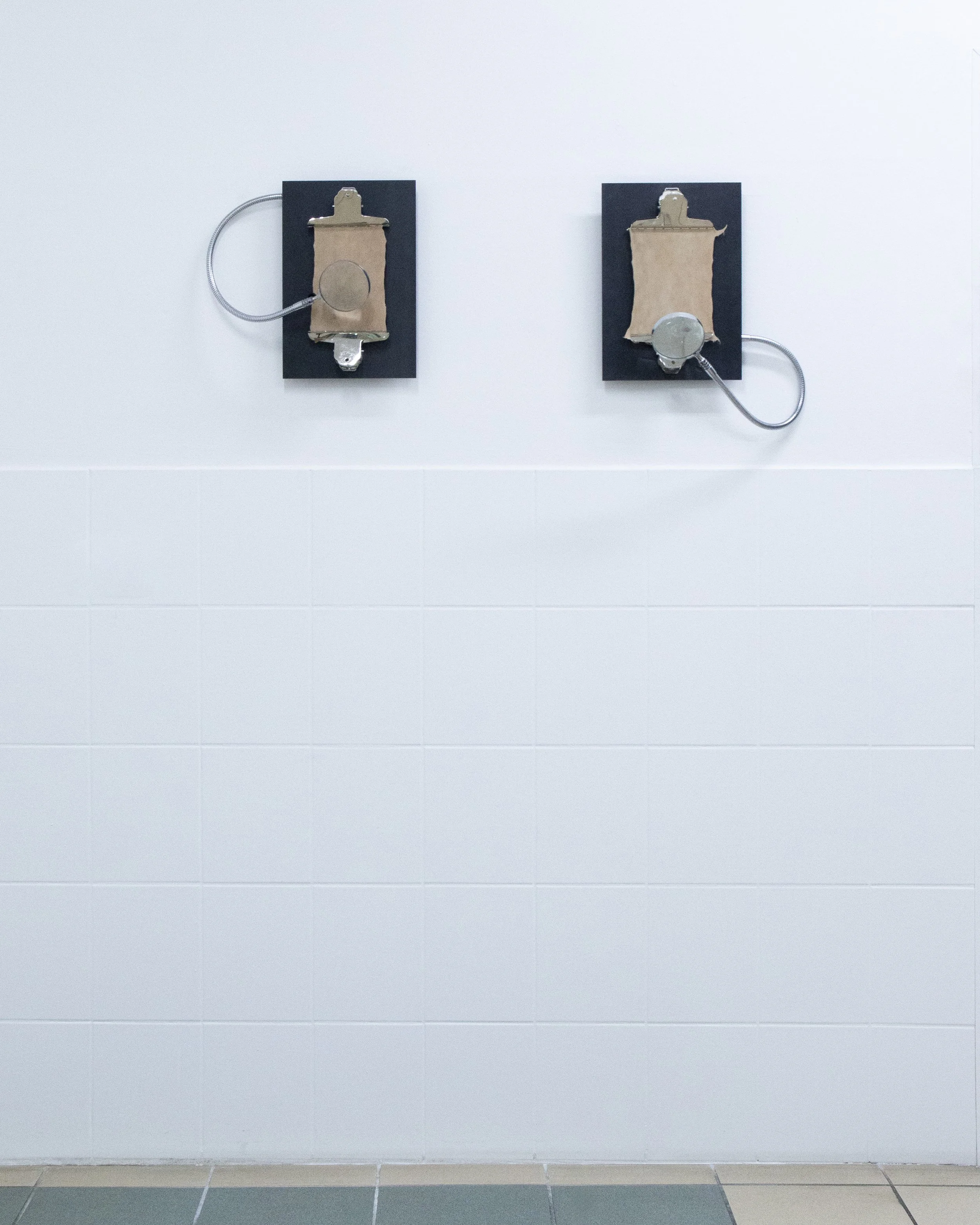 4 piece installation silicone skins with hyperrealistic airbrush paint and human hair, metal and magnifying glass