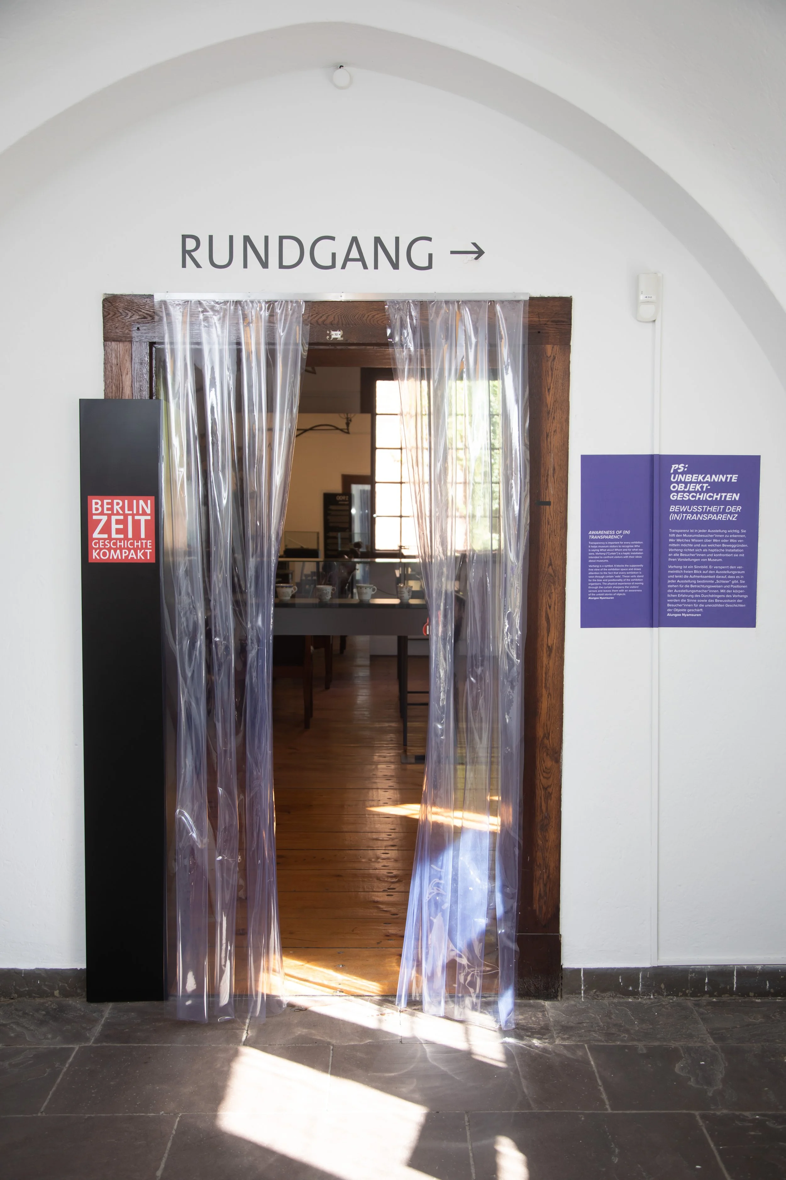 Vorhang is a symbol. It blocks the supposedly free view of the exhibition space and draws attention to the fact that every exhibition is seen through certain veils. These veils stand for the bias and positionality of the exhibition organisers. The physical experience of moving through the curtain sharpens the visitors’ senses and leaves them with an awareness of the untold stories of objects.